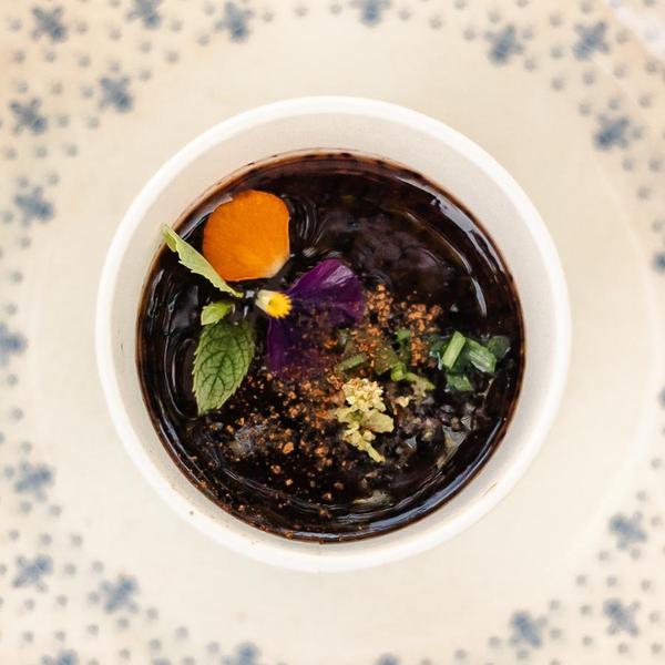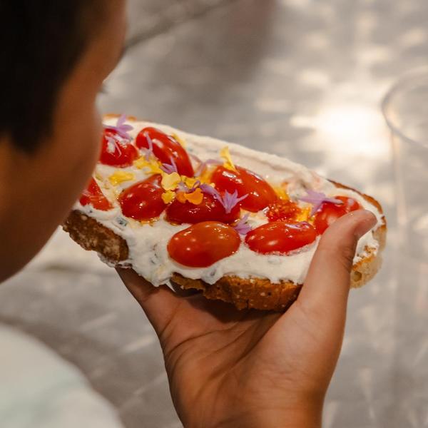 Bruschetta de tomate cherry con crema de albahaca, cebollino y pétalos de tulbaghia / Cherry tomato bruschetta with basil cream, chives and tulbaghia petals