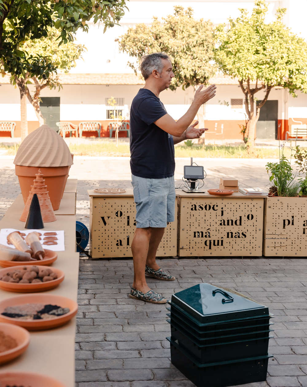 Es por esto mismo que estamos probando diferentes estrategias de aclimatación, como trasladarlas a lugares más frescos o intentar refrescarlas. Por eso hemos hecho un tercer prototipo en arcilla hackeando una maceta típica con una tapa impresa en 3D, que distribuye el agua que le cae de los aires acondicionados para mantenerla fresca por evapotranspiración.